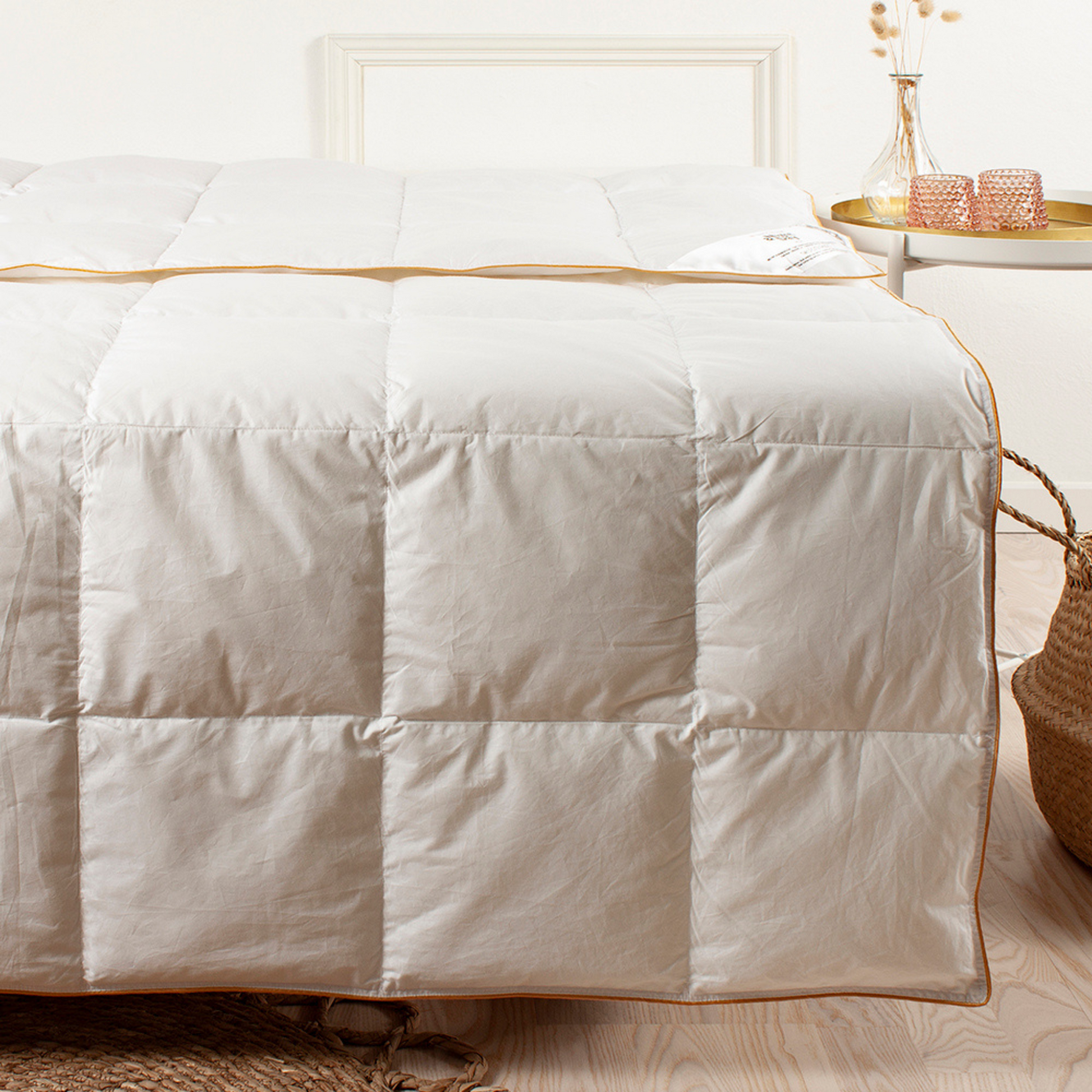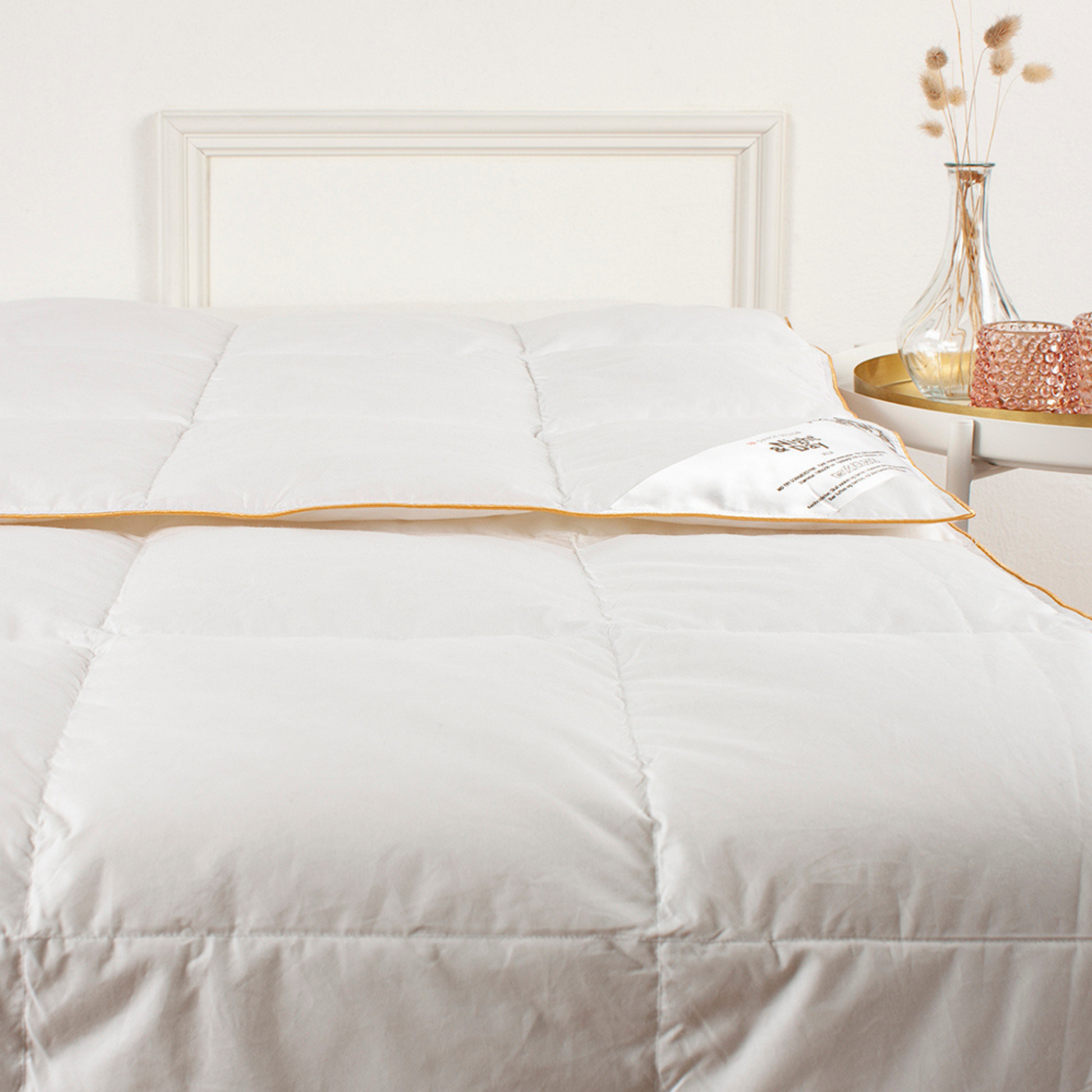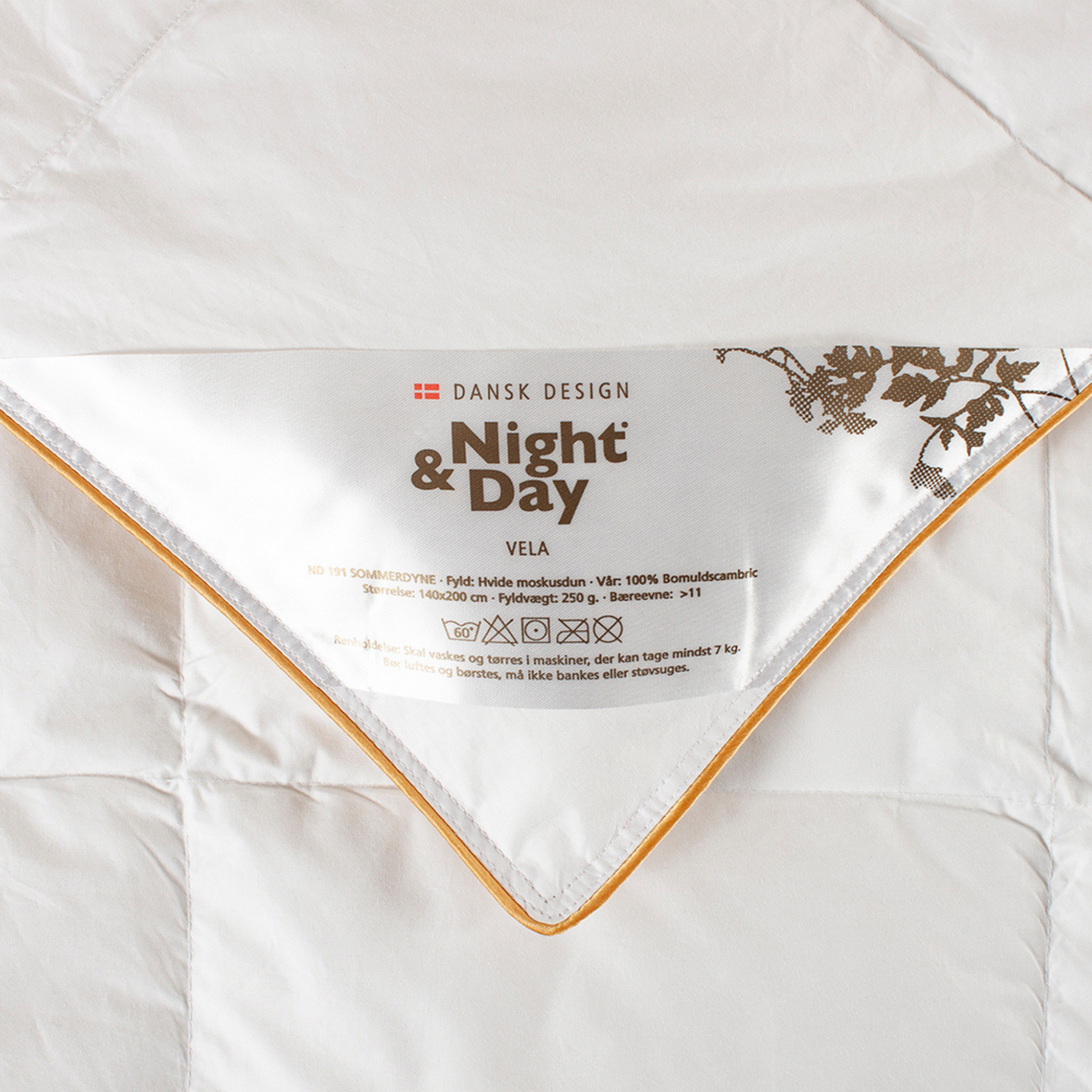 Moskusdyne med hvide moskusdun - skøn let sommerdyne. Lækker og let kassettedyne, med 7x10/11 fastsyede kassetter, med fyldgram 250/275g. Disse kassetter eller rum gør at der altid er dun fordelt over hele dynen. Denne sommerdundyne fås i 140x200/220 cm eller som dobbeltdyne med ekstra længde 200x220 cm. Dundynen har en bæreevne på 11+, hvilket betyder at dynen har mindst 95% dun. Dynen bør rystes hver dag - må ikke bankes og støvsuges.